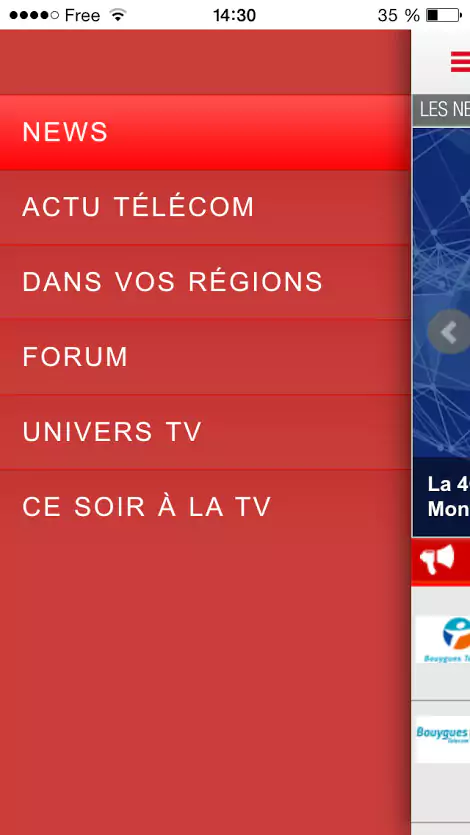 La navigation a entièrement été revue puisqu’elle se fait à l’aide d’un menu à gauche (drawer), dans lequel vous retrouvez toutes vos rubriques habituelles : News, Actu télécom, Actu TV, vidéos, etc…