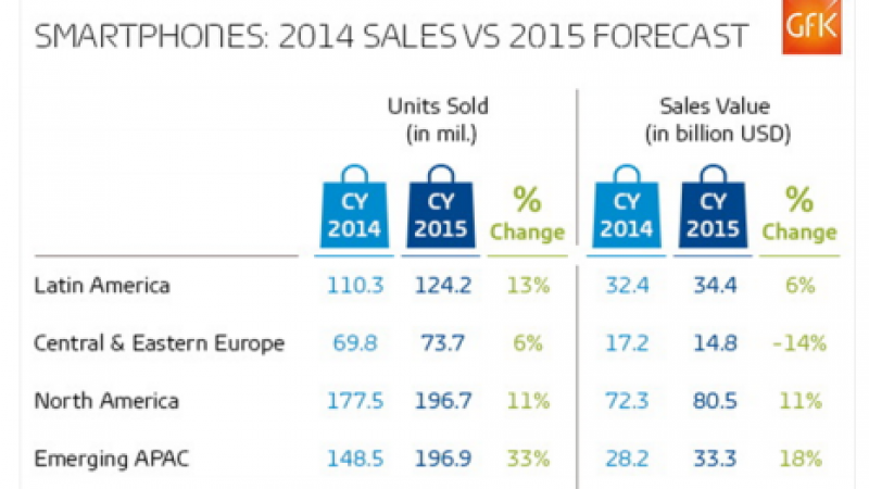 Le premier trimestre 2015 a connu un glissement sans précédent de la demande vers des écrans plus grands (supérieur à 5 pouces) et dont les 166 millions d’unités vendus ont représenté 47% du marché mondial des smartphones. En Amérique du Nord, la part des terminaux dotés de grand écran a atteint 70% ce trimestre, en progression de +59% par rapport à la même période l’an passé, poussée par les modèles haut de gamme. GfK prévoit que cette appétence des consommateurs pour les larges tailles d’écran se poursuivra en 2015, pour représenter 69% des volumes de vente de smartphones en 2015, soit une solide hausse de 30%.