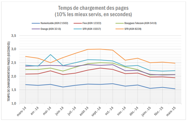 Le temps de chargement médian des pages des sites membres de l’Observatoire GESTE en France est de 6,0 secondes, mesuré sur les principaux fournisseurs d’accès internet français (Orange, Free, SFR,Bouygues Telecom et Numéricable),du 1er au 31 mars 2015. 30,2 secondes séparent les utilisateurs les mieux servis des utilisateurs les moins bien servis. Numéricable offre les meilleures performance, mais en ADSL, c’est Free qui obtient les meilleurs résultat. Cela va à l’encontre des résultats publiés par l’ARCEP, mais la méthodologie est différente puisque l’ARCEP se basesur des robots qui simulent la navigation sur une dizaine de sites, et le GESTE se base sur une navigation réelle sur les sites partenaires.