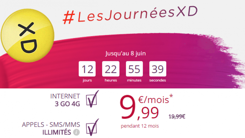 Virgin Mobile affiche une nouvelle offre promotionnelle dans le cadre de l’opération « Les Journées XD » et propose de l’illimité et 3Go de data en 4G pour 9.99 euros par mois, pendant 1 an (au lieu de 19.99 euros par mois).