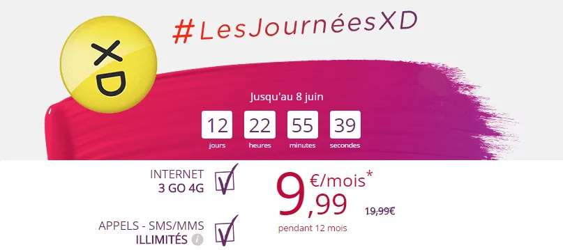 Virgin Mobile affiche une nouvelle offre promotionnelle dans le cadre de l’opération « Les Journées XD » et propose de l’illimité et 3Go de data en 4G pour 9.99 euros par mois, pendant 1 an (au lieu de 19.99 euros par mois).
