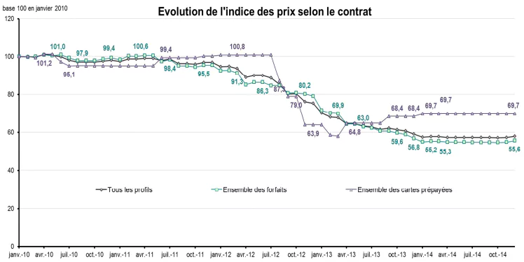 Les prix des services mobiles sont relativement stables au cours de l’année 2014. L’indice annuel pour 2014 est néanmoins en baisse de 10,0 % en moyenne annuelle (à comparer à une baisse de 26,3 % en 2013) du fait des baisses de tarifs sur l’année 2013 (en partie grâce à l’arrivée de Free dans le mobile).