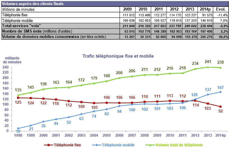 L’ensemble du trafic téléphonique fixe et mobile décroît pour la première fois (-0,9% en un an). La progression de la voix sur les réseaux mobiles ne compense pas la baisse du trafic fixe entamée en 2013 (-11,8 milliards de minutes en 2014). Le trafic fixe atteint ainsi son plus bas niveau depuis 1998. Le volume de communications au départ des téléphones mobiles s’élève à 147 milliards de minutes en 2014 en croissance de 7,0% sur un an. Toutes les destinations d’appels participent à cette croissance, grâce notamment à la généralisation des offres d’abondance des opérateurs.