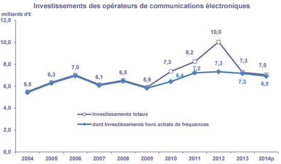 Le montant des investissements est en léger retrait par rapport aux trois années précédentes mais demeure supérieur à la moyenne des dix dernières années. Le montant total (hors montant des achats de fréquences) réalisés par les opérateurs de communications électroniques au cours de l’année 2014 recule de 3,5% en un an. Il est estimé à 6,9 milliards d’euros, soit un niveau supérieur à la moyenne des dix dernières années qui se situe à 6,5 milliards d’euros.