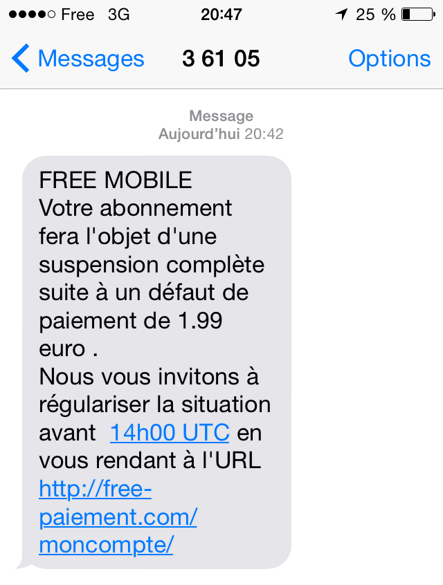 Le SMS frauduleux reçu par les abonnés sur leurs numéros Free Mobile est le suivant : « Free Mobile. Votre abonnement fera l’objet d’une suspension complète suite à un défaut de paiement de 1.99 euro . Nous vous invitons à régulariser la situation avant 14h00 UTC en vous rendant à l’URL http://free-paiement.com/moncompte/ ».