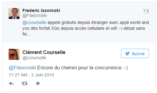 L’offre évoquée est disponible « à partir de 26.99eur si déjà client pour forfait sans engagement B&you 5Go. 5Go data roaming par an (…) les appels gratuits depuis étranger avec appli world and you dès forfait 3Go depuis accès cellulaire et wifi..débat sans fin…», précise-t-il en répondant aux interrogations d’un Freenaute. Ce dernier lui rétorque avec ironie, qu’il reste donc « encore du chemin pour la concurrence ».