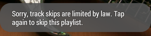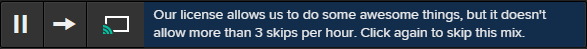 Seul léger souci, vous ne pourrez passer/sauter une musique que 3 fois par heure, si vous dépassez cette limite et que vous essayez de passer une musique vous pourrez uniquement aller à la playlist suivante. Le problème est dû au fait que les musiques proviennent de soundcloud et que la licence du site ne permet pas de passer plus de 3 musiques par heure.