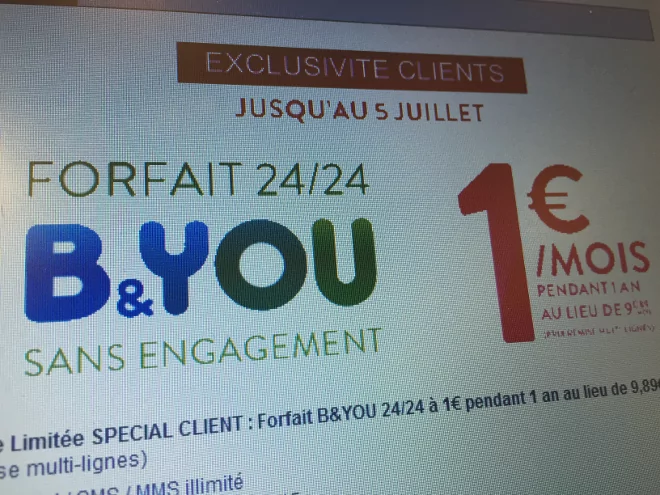 Dans quelques jours, l’opérateur proposera à ses abonnés, une série limitée permettant de bénéficier du « Forfait B&You 24h/24 20 Mo » pour 1 € par mois pendant 1 an, au lieu de 10.90 € par mois (ou 9,89€/mois avec la remise multi-lignes incluse). Ce forfait, sans engagement, inclut les appels/SMS/MMS illimités en France métropolitaine (ainsi que les SMS illimités vers les DOM) et 20 Mo de Data en 4G+ (0.05€ par Mo au delà, autrement dit 25€ pour 500 Mo ou 50€ pour 1Go).