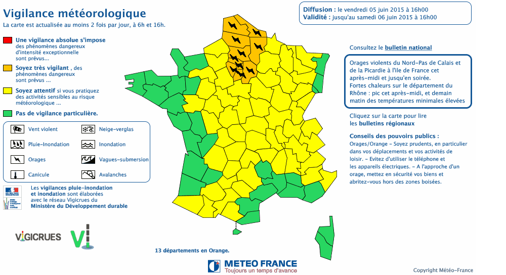 Si vous habitez dans le Nord-Pas de Calais, la Picardie ou l’Ile-de-France, pensez à mettre vos Freebox à l’abri des intempéries. Plusieurs départements ont été placés en alerte orange en raison des violents orages prévus cet après-midi et ce soir. L’alerte est valable jusqu’au 6 juin 2015 à 16h00 selon la carte de vigilance de Météo-France.