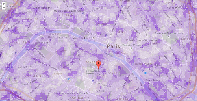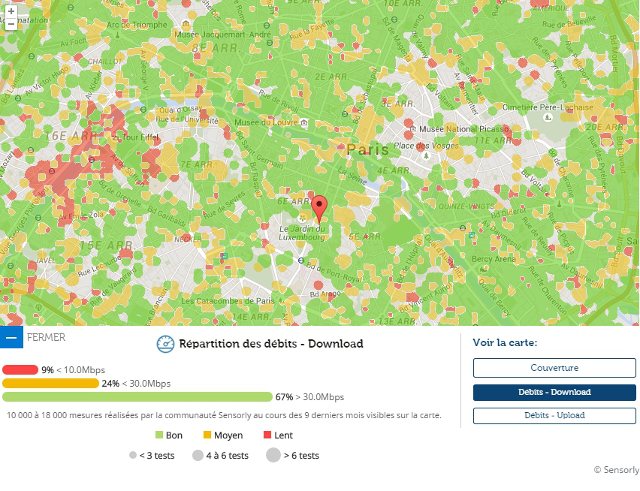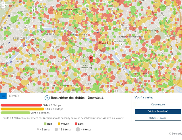 La couverture 4G quant à elle, bien qu’un peu moins bonne qu’en 3G, couvre aussi tout Paris. Le débit 4G lui semble cependant prendre la direction opposée du débit 3G avec 67% des zones supérieures à 30 Mbps, 24% compris entre 10 et 30 Mbps et seul 9 petits pourcents sous la barre des 10 Mbps.