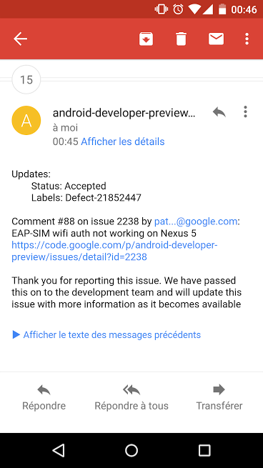 Si cette lacune avait déjà été signalée par le bugtracker d’Android, grâce à vos nombreuses contributions suite à la parution du précédent article, Google accélère – enfin – le mouvement (sachant que le problème dure depuis plusieurs années).