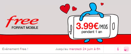 Jeudi dernier, Free lançait une offre promotionnelle est réservée sur le site vente-privée. Celle-ci propose le Forfait Free 19,99€/mois avec une remise mensuelle exceptionnelle de 16€/mois pendant 12 mois valable sur le Forfait Free, soit le forfait Free à 3.99€/mois.