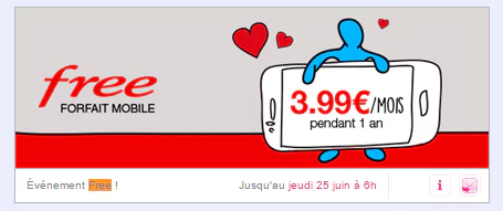 24 heures de plus pour les retardataires ! Free prolonge une nouvelle fois l’offre disponible sur Vente-Privée à 3.99€/mois. Jeudi dernier, Free lançait une offre promotionnelle sur le site vente-privée.com. Celle-ci propose le Forfait Free 19,99€/mois avec une remise mensuelle exceptionnelle de 16€/mois pendant 12 mois valable sur le Forfait Free, soit le forfait Free à 3.99€/mois.