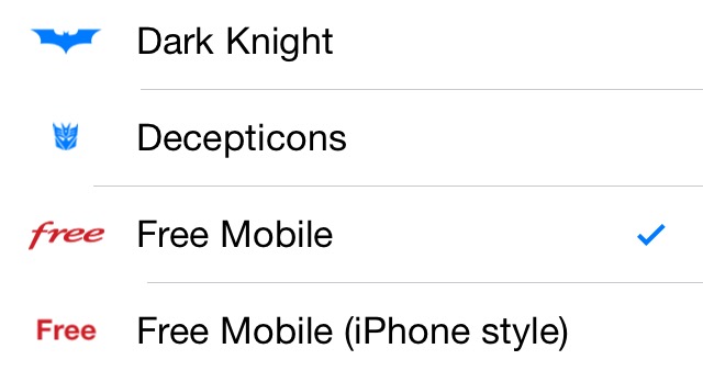 Une fois téléchargés et installés, rendez vous dans les « Réglages » de votre terminal. Défilez ensuite jusqu’au menu « Zeppelin » puis appuyez sur « Thème ». Il ne vous reste plus qu’à choisir un des logos de Free Mobile (ou d’autres logos présents dans le tweak : SFR, Orange, Bouygues Télécom, Virgin Mobile, ou encore ceux de Batman, Apple, Android, Nike, etc).