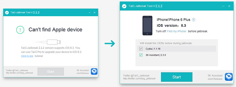 2. Lancez TaiG 2.1.2. Une fois lancée, décochez 3K Assistant 2.3.0 (sauf si vous souhaitez ajouter certaines applications, fonds d’écran, sonneries, jeux et plug-ins recommandés par l’équipe TaiG).