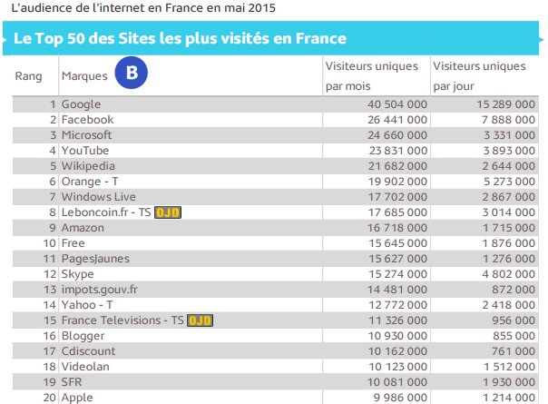 Médiamétrie vient de publier l’audience de l’Internet en France en mai 2015. Les opérateurs télécom s’y trouvent en bonne place. Le premier d’entre eux est Orange, qui se classe 6ème avec 19,9 millions de visites par mois. On retrouve ensuite Free, en 10ème position avec 15,64 millions de visites par mois, puis SFR, en 19ème position avec 10,08 millions de visites. Quant à Bouygues Télécom, il n’est pas présent dans ce TOP 50 (ni même le groupe Bouygues).