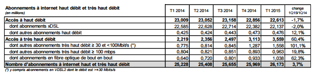 Le nombre de souscriptions aux accès au très haut débit atteint 3,6 millions au 31 mars 2015. La majorité de la croissance annuelle (+783 000) provient des abonnements dont le débit est compris entre 30 et 100 Mbits/s (1,6 million au premier trimestre 2015). Les souscriptions aux autres modes d’accès au très haut débit sont également en hausse et notamment les abonnements en fibre optique de bout en bout (1 million, soit +400 000 en un an). Les accès disposant d’un débit supérieur ou égal à 100 Mbits/s (963 000, soit +159 000 en un an). Fin mars 2015, le nombre d’abonnés au très haut débit atteint 26% du nombre total de logements éligibles au très haut débit toutes technologies confondues (+7 points en un an).