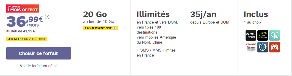 Rebelote avec les Forfaits, l’opérateur lance une nouvelle promotion permettant de profiter d’un mois gratuit en souscrivant sur Internet exclusivement, en plus de celles déjà disponibles (moins 5€ sur la box si l’abonné est déjà client fixe Numericable-SFR). Ce mois gratuit est valable sur l’ensemble des Forfaits 4G de Numericable-SFR (100Mo, 1Go, 5Go, 10Go, 15Go et 20Go). Les tarifs de ces forfaits se situent entre 4.99€/mois à 64.99€/mois. Il propose également de doubler la data (de 10 Go à 20 Go sur l’exemple ci-dessous en capture, ou de 15 Go à 30 Go… etc), mais exclusivement à ses clients box.