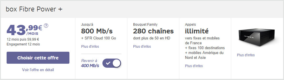 Concernant la fibre ou l’ADSL, Numericable-SFR présente toujours plusieurs promos permettant de profiter de remises (jusqu’à 16 euros de réduction selon l’abonnement) pendant 12 mois. Toutefois, les différentes formules (Fibre Starter, Fibre Power et Fibre Power+) sont soumises à un engagement de 12 mois (sans compter les frais de dépôt de garantie du décodeur TV de 49€ ou de 75€ pour la BOX Fibre de SFR).