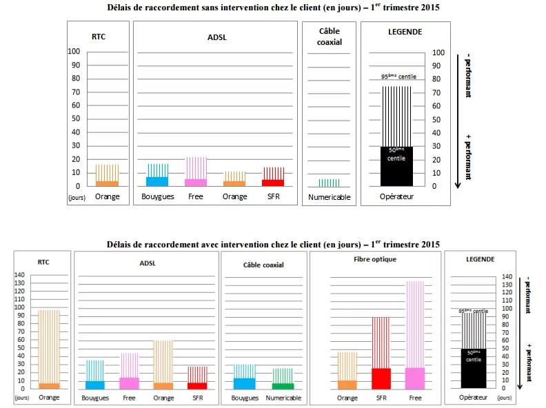L’histogramme plein représente le 50ème centile des délais de raccordement, c’est-à-dire le délai en deçà duquel sont activés 50% des raccordements les plus rapides. L’histogramme hachuré représente le 95ème centile des délais de raccordement, c’est-à-dire le délai en deçà duquel sont activés 95% des raccordements les plus rapides.