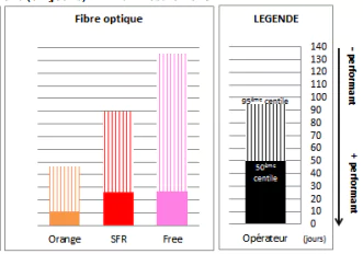 L’histogramme plein représente le 50ème centile des délais de raccordement, c’est-à-dire le délai en deçà duquel sont activés 50% des raccordements les plus rapides.