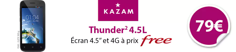 Le premier est le Kazam Thunder² 4.5L. Il avait cette particularité d’être le smartphone 4G le moins cher de la boutique car Free bénéficiait d’un partenariat avec Kazam ce qui avait permis de passer son tarif de 99€ à 79€. Kazam venait d’ailleurs de communiquer récemment sur ce partenariat.