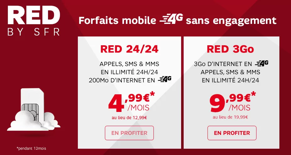 Ces offres promotionnelles sont réservées exclusivement aux nouveaux clients. Elles ne sont pas disponibles pour les clients SFR encore engagés qui souhaiteraient changer d’offre pour une offre RED.