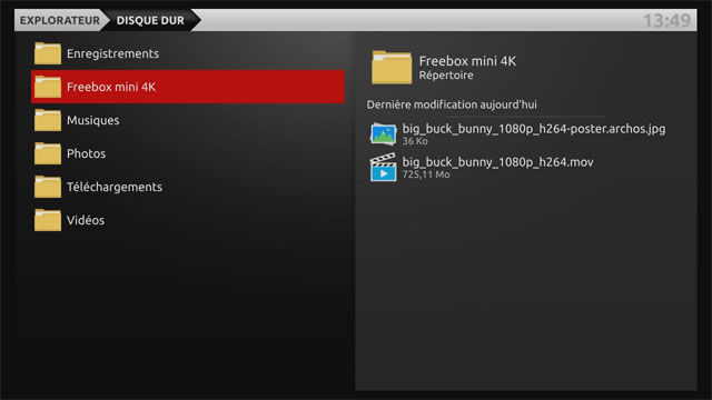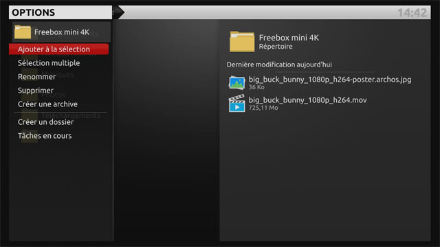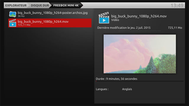 Enfin, en continuant à descendre dans l’arborescence, lorsque l’on affiche un fichier dans la colonne de gauche, celle de droit affiche directement certaines informations comme la durée de la vidéo, la taille, etc. Et, petite nouveauté, la vidéo commence à être lue dans une miniature. Cela fonctionne également pour lire les images et même les fichiers TXT. Très pratique lorsque l’on cherche une vidéo puisqu’il n’y a pas besoin de la lancer et de revenir ensuite dans la liste des fichiers.