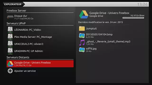 L’accès au stockage dans le Cloud est désormais possible depuis la Freebox Révolution grâce à la nouvelle mise à jour. Quatre services de stockage sont disponibles : Google Drive, Dropbox, OneDrive et Put.io. Pour accéder à cette nouvelle fonctionnalité il vous suffit d’allez depuis le menu principal dans Disques>Mes disques, une fois sur l’explorateur vous aurez accès au disque dur de la Freebox Révolution et aux différents appareils connectés aux réseaux mais c’est la dernière catégorie qui nous intéresse ici, les "Serveurs Distants".