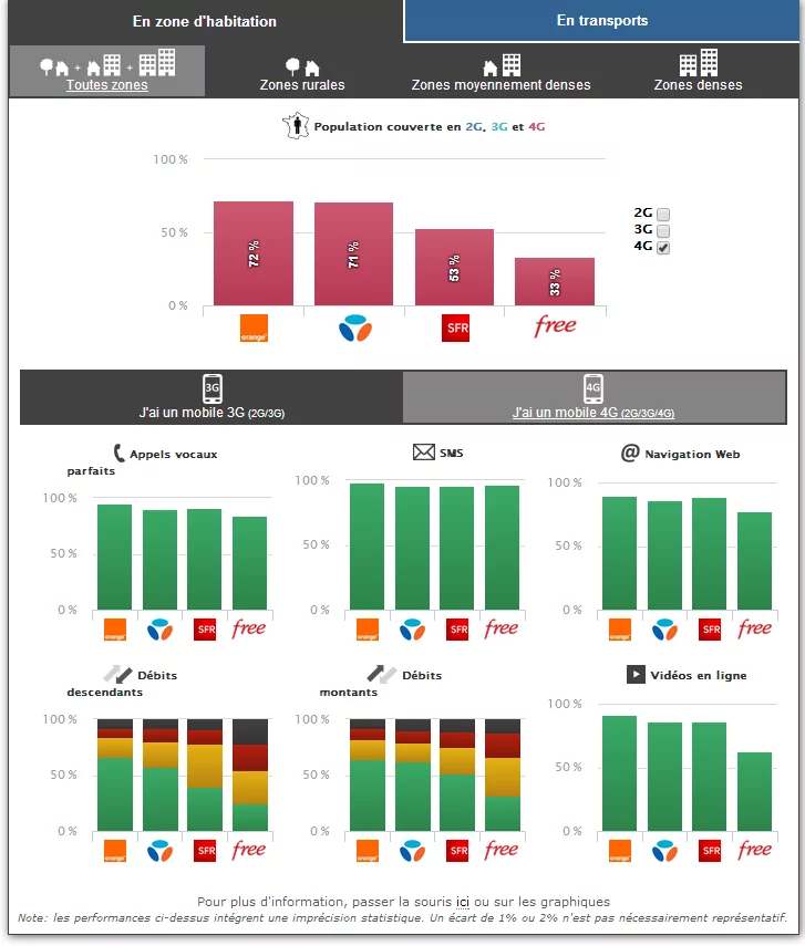 A noter toutefois que concernant la couverture, l’ARCEP utilise des données obsolètes, en particulier en 4G puisque les mesures dates de décembre 2014. Depuis, Free a doublé le nombre de ses antennes 4G et il a donc une couverture nationale supérieure à 33% de la population à ce jour.