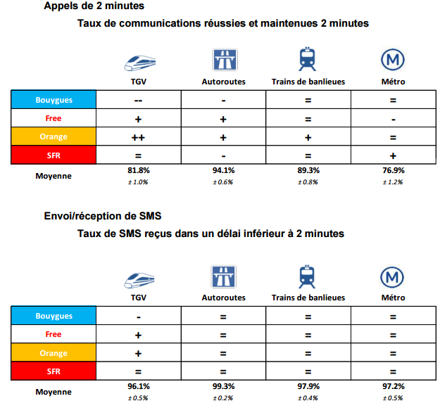 Dans son observatoire sur la qualité mobile de Free, SFR, Bouygues Télécom et Orange, l’ARCEP a réalisé une série de mesures dans les transports (avec un terminal 2G/3G/4G). Nous vous proposons de découvrir les résultats pour les 4 opérateurs dans le TGV, les trains de banlieue, les autoroutes et le métro.