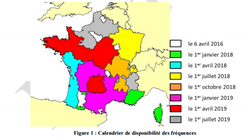 À partir du 1er juillet 2019, les opérateurs titulaires auront le droit d’utiliser les fréquences attribuées sur l’ensemble du territoire métropolitain. Entre le 6 avril 2016 et le 1er juillet 2019, ils auront le droit d’utiliser les fréquences attribuées progressivement sur le territoire. À cet égard, les opérateurs pourront mettre en service des stations radioélectriques selon le calendrier indiqué par la carte suivante :