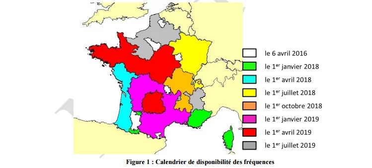 À partir du 1er juillet 2019, les opérateurs titulaires auront le droit d’utiliser les fréquences attribuées sur l’ensemble du territoire métropolitain. Entre le 6 avril 2016 et le 1er juillet 2019, ils auront le droit d’utiliser les fréquences attribuées progressivement sur le territoire. À cet égard, les opérateurs pourront mettre en service des stations radioélectriques selon le calendrier indiqué par la carte suivante :