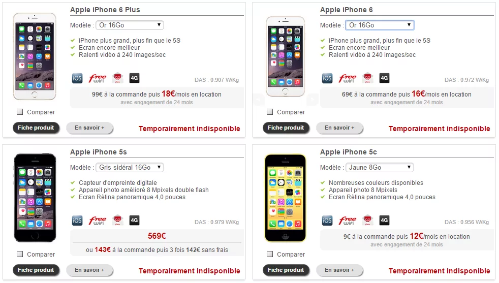 Actuellement, de nombreux modèles d’iPhone sont temporairement indisponibles. Si vous souhaitiez acquérir l’iPhone 6 dans la boutique Free Mobile, passez votre chemin pour les modèles 16 Go et 64 Go (toutes couleurs confondues). Vous pouvez néanmoins vous rabattre sur l’iPhone 6 128 Go (Or, Gris sidéral et Argent).