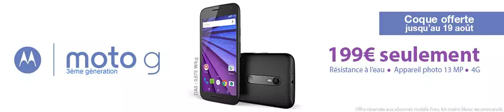 Un nouveau mobile est disponible dans la boutique en ligne de Free Mobile. Il s’agit de la troisième génération du Moto G de Motorola. Puissant et abordable, le nouveau Moto G offre un bon rapport qualité-prix. De plus, pour tout achat du best-seller de Motorola, une coque bleue est offerte jusqu’au 19 août 2015.
