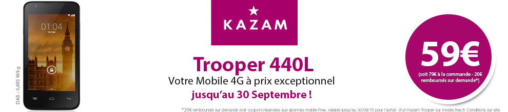 Il est de retour dans une version survitaminée, et à un prix totalement Free. Le Kazam Trooper 440 L est équipé d’un processeur Quadcore (Mediatek MT6582 + MT6590) à 1,3 GHz, épaulé par 1 Go de mémoire vive (contre 512 Mo pour la précédente version proposée par Free).