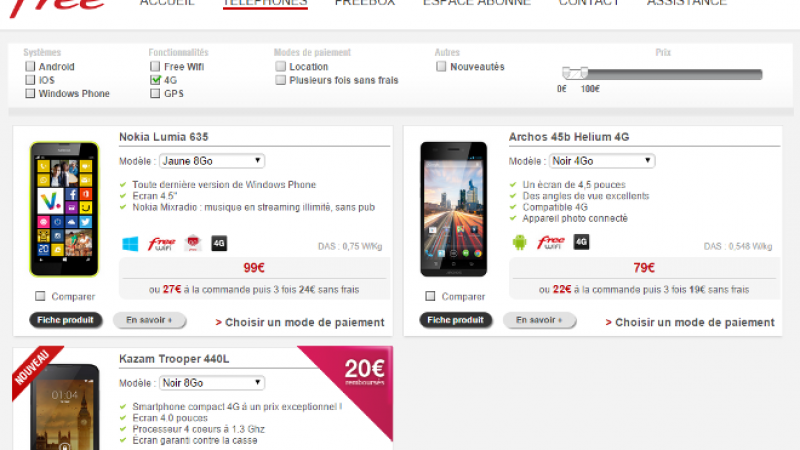Si vous recherchez un mobile 4G à moins de 100€, vous trouverez peut être votre bonheur sur la boutique mobile de Free. En utilisant son comparateur, vous pourrez découvrir que l’opérateur propose trois modèles ne dépassant pas ce prix : le Kazam Trooper 440L, l’Archos 45b Helium 4G et le Microsoft Lumia 635.