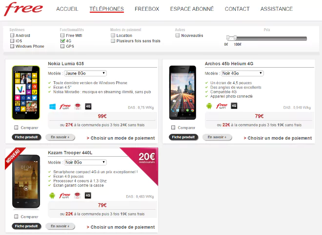 Si vous recherchez un mobile 4G à moins de 100€, vous trouverez peut être votre bonheur sur la boutique mobile de Free. En utilisant son comparateur, vous pourrez découvrir que l’opérateur propose trois modèles ne dépassant pas ce prix : le Kazam Trooper 440L, l’Archos 45b Helium 4G et le Microsoft Lumia 635.