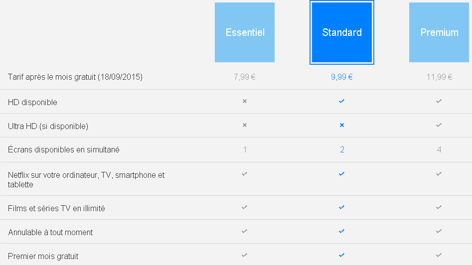 Ce matin, Netflix a fait évoluer ses tarifs en France, confirmant ainsi une rumeur qui courait depuis quelques semaines. Moins d’un an après son arrivée, le géant américain a en effet revu à la hausse l’un de ses 3 forfaits, nommé « standard », qui permet d’accéder au service sur 2 écrans simultanément et à la HD (mais pas à la 4K). Jusqu’ici ce forfait était proposé à 8,99€/mois. Depuis ce matin, ce tarif est monté à 9,99€/mois pour les nouveaux abonnés. Un tarif aligné sur celui de Canalplay, lorsque celui-ci est souscrit sur le téléviseur. Comme auparavant, le premier mois reste gratuit.