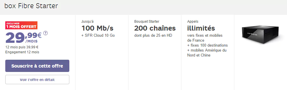 La plus petite « Box Fibre Starter » commence à 29,99 euros par mois pendant 12 mois (puis 39,99 euros/mois). Celle-ci inclut un accès internet jusqu’à 100 Mb/s, la télévision by Numericable (Bouquet Starter 200 chaînes dont 25 en HD) et les appels illimités vers fixes et mobiles de France + les fixes de 100 destinations (+ les mobiles Amérique du Nord et Chine). Auparavant, cette même offre était affichée à 25.99 euros avec un débit allant jusqu’à 1Gb/s…