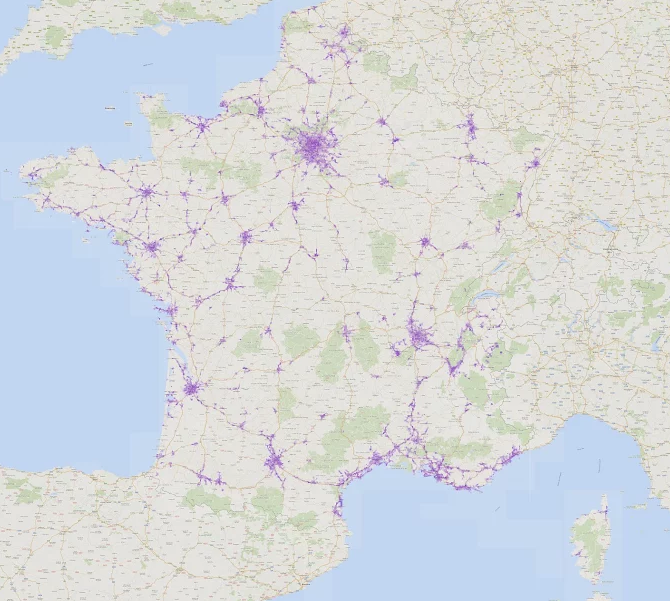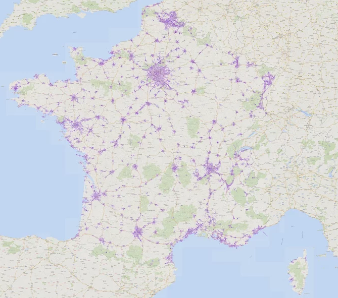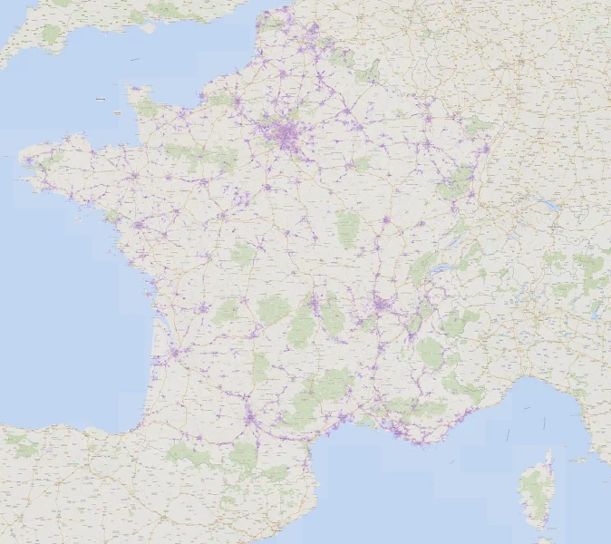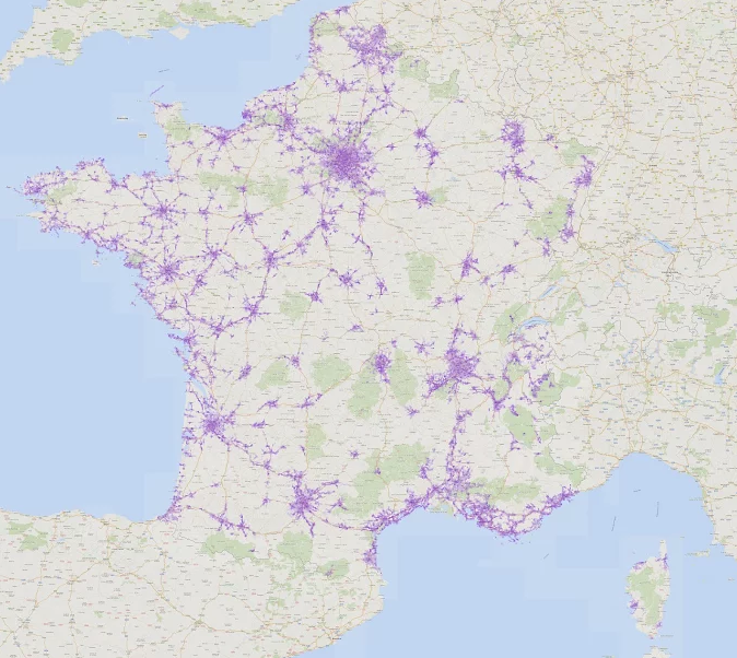 Afin de pouvoir comparer la couverture des 4 opérateurs en ce mois d’août, Sébastien, un lecteur d’Univers Freebox, a réalisé un gros travail en utilisant les cartes de couverture 4G de notre partenaire Sensorly. Celles-ci sont réalisées à partir de centaines de milliers de mesures réelles sur le terrain. Cependant il n’est pas possible d’avoir une vision précise de la couverture nationale 4G des opérateurs, les pixels étant trop gros. Sébastien a donc fait des capture avec un zoom et une précision plus importante, puis a assemblé toutes ces captures pour refaire des cartes nationale de la couverture 4G de chaque opérateur. Il en résulte des cartes de 6000 x 5400 pixels qui permettent de comparer la couverture 4G des différents opérateurs. Elle ont été réalisées en date du 18/08/15