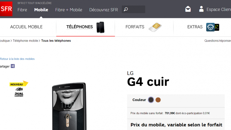 En effet, il y a comme un petit problème sur le site de vente en ligne de l’opérateur au Carré Rouge. Depuis son lancement, SFR commercialise le dernier flagship du constructeur LG. Pour le mettre en valeur, SFR utilise plusieurs images du LG G4. Mais, l’une d’elles est estampillée avec le logo… Orange F (seul le G4 Noir est concerné par cette bourde. Pas de souci pour le G4 Brun).