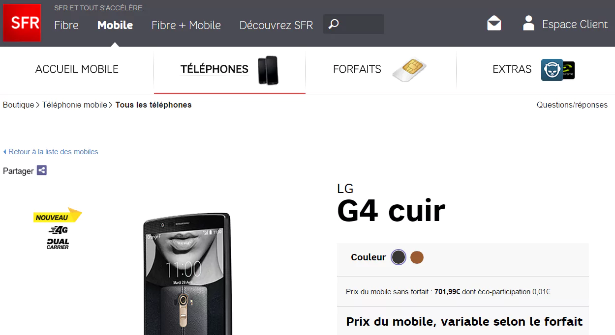 En effet, il y a comme un petit problème sur le site de vente en ligne de l’opérateur au Carré Rouge. Depuis son lancement, SFR commercialise le dernier flagship du constructeur LG. Pour le mettre en valeur, SFR utilise plusieurs images du LG G4. Mais, l’une d’elles est estampillée avec le logo… Orange F (seul le G4 Noir est concerné par cette bourde. Pas de souci pour le G4 Brun).