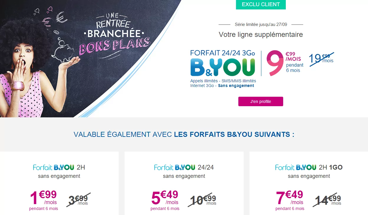 Cependant, ces remises de 50% ne sont disponibles que pour ceux qui disposent d’un premier forfait B&You. Il s’agit donc d’un deuxième forfait, qui n’est pas substituable au premier. Pour en bénéficier, il faut donc choisir un premier forfait B&You à plein tarif.