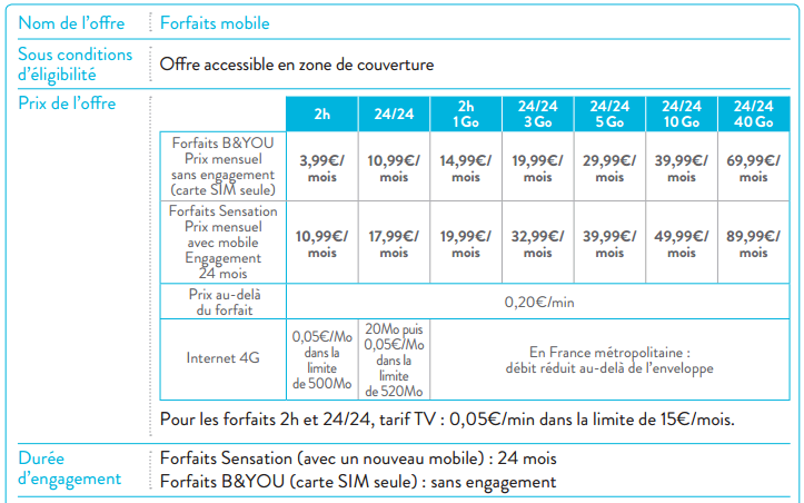 Les tarifs de la gamme « B&You » s’étendent de 3.99€ par mois pour 2h d’appels et les SMS/MMS illimités à 69.99€ par mois pour les appels/SMS/MMS illimités et 40 Go d’Internet Mobile en 3G/4G/4G+ (débit réduit au delà).