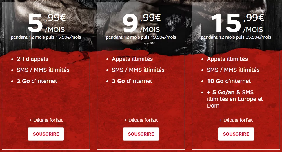 10€ de plus également pour le forfait RED 2 Go à 5.99€/mois Néanmoins le client conserve les 2 Go de data après les 12 mois de promotion (alors qu’il ne les conservait pas lors des précédentes journées guerrières).