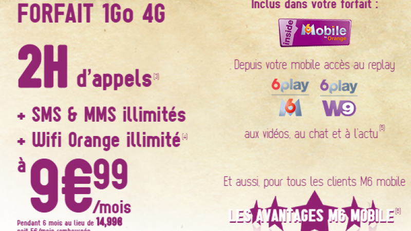 M6 Mobile propose une nouvelle offre promotionnelle pour la rentrée. Celle-ci est valable jusqu’au 7 octobre 2015. Ainsi, l’opérateur propose un forfait, avec engagement de 12 mois, incluant 2 heures d’appels, les SMS/MMS illimités, l’accès aux hotspots WiFi d’Orange et 1 Go de data pour 9.99€/mois pendant 6 mois (puis 14.99€/mois).