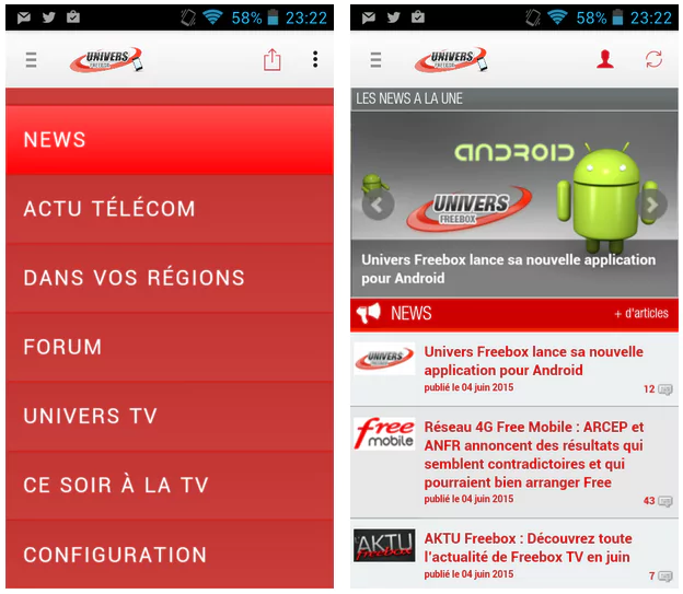 L’application Univers Freebox vous permet de suivre toute l’actualité du site, à l’aide d’un menu à gauche (drawer), dans lequel vous retrouvez toutes vos rubriques habituelles : News, Actu télécom, Actu TV, vidéos, le forum, etc…