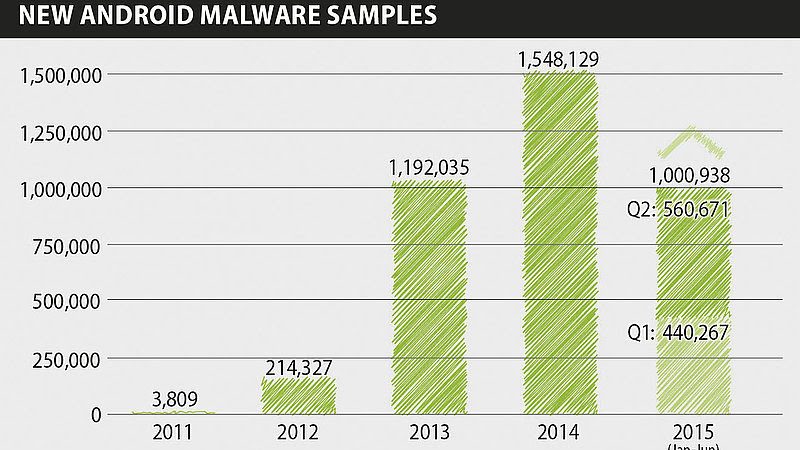 Au deuxième trimestre 2015, 6100 nouveaux programmes malveillants ciblant Android étaient détectés chaque jour. Il y en avait 4900 au premier trimestre 2015, ce qui représente une augmentation de 25%.