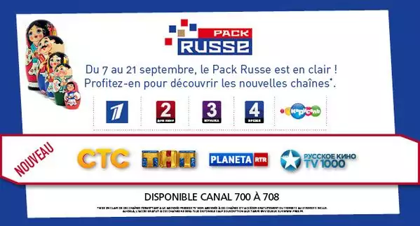 Le pack Russe de Freebox TV s’est enrichi en ce mois d’aout de 4 nouvelles chaînes. Ainsi, en plus des chaînes Channel One Russia (canal 701), Dom Kino (706), Muzika Pervoyo (707), Vremya (708) et Karusel (700), le pack Russe a intégré les chaînes :